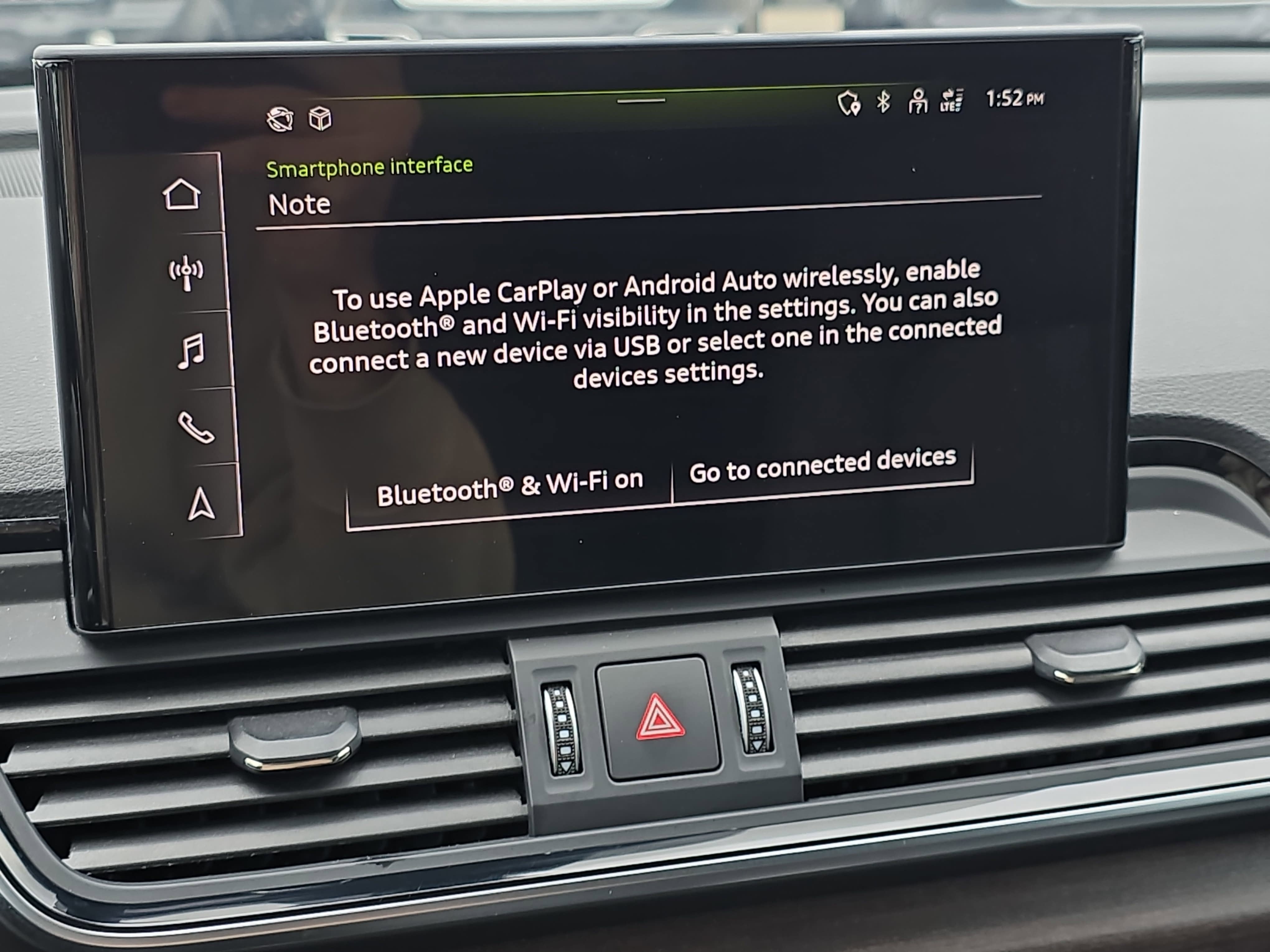 - Radio: Audi Sound System -inc: Audi smartphone interface w/wireless Apple CarPlay, preparation for mobile phone (Bluetooth®), MMI touch display w/10.1" center screen and 2 rear USB charge ports